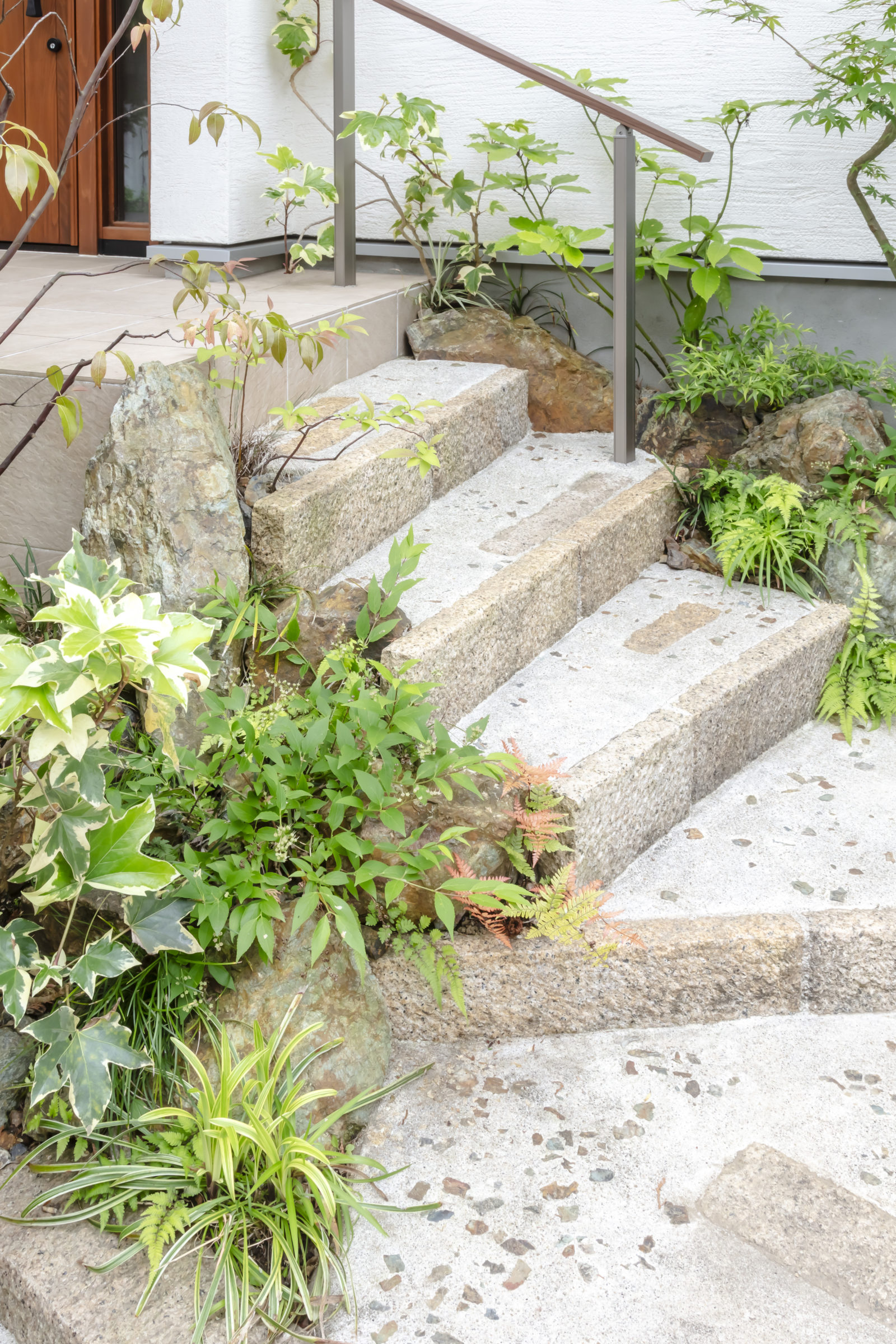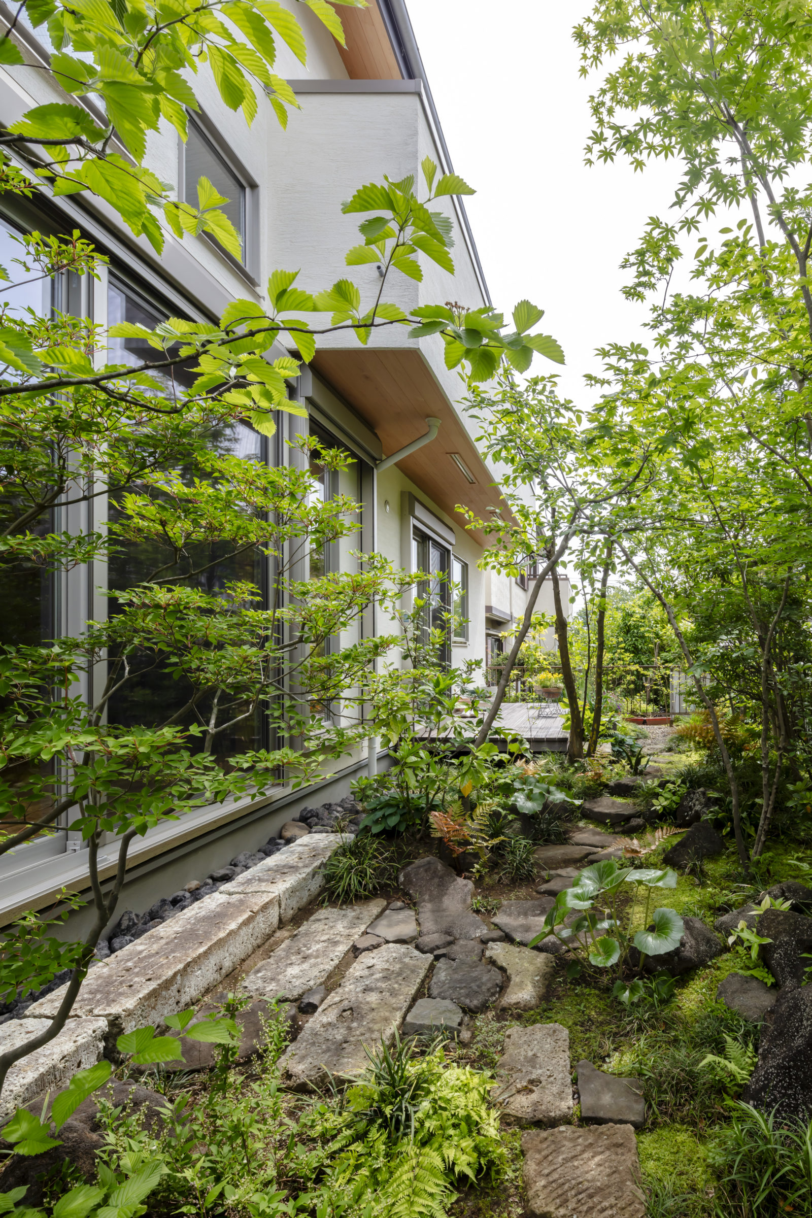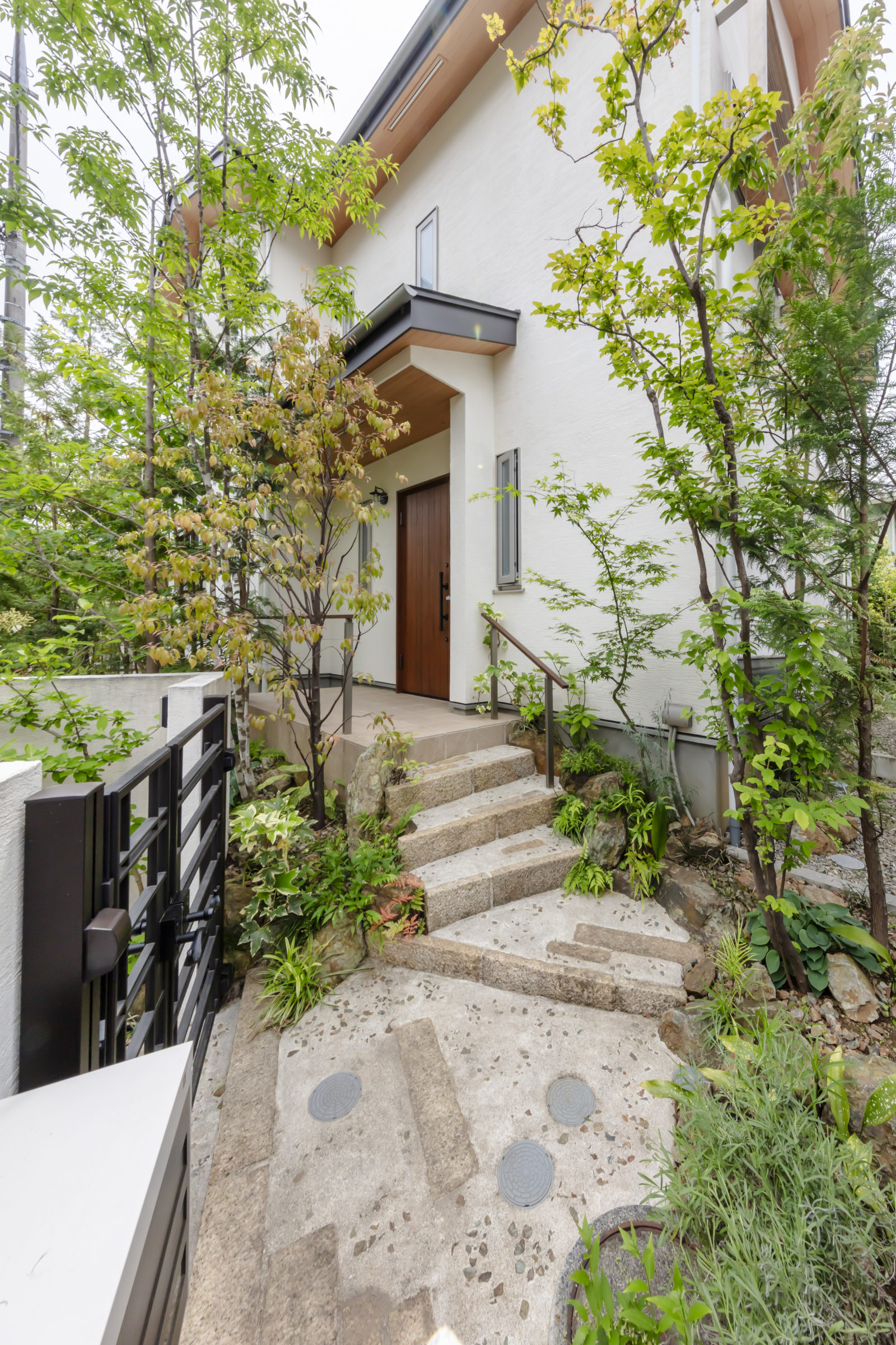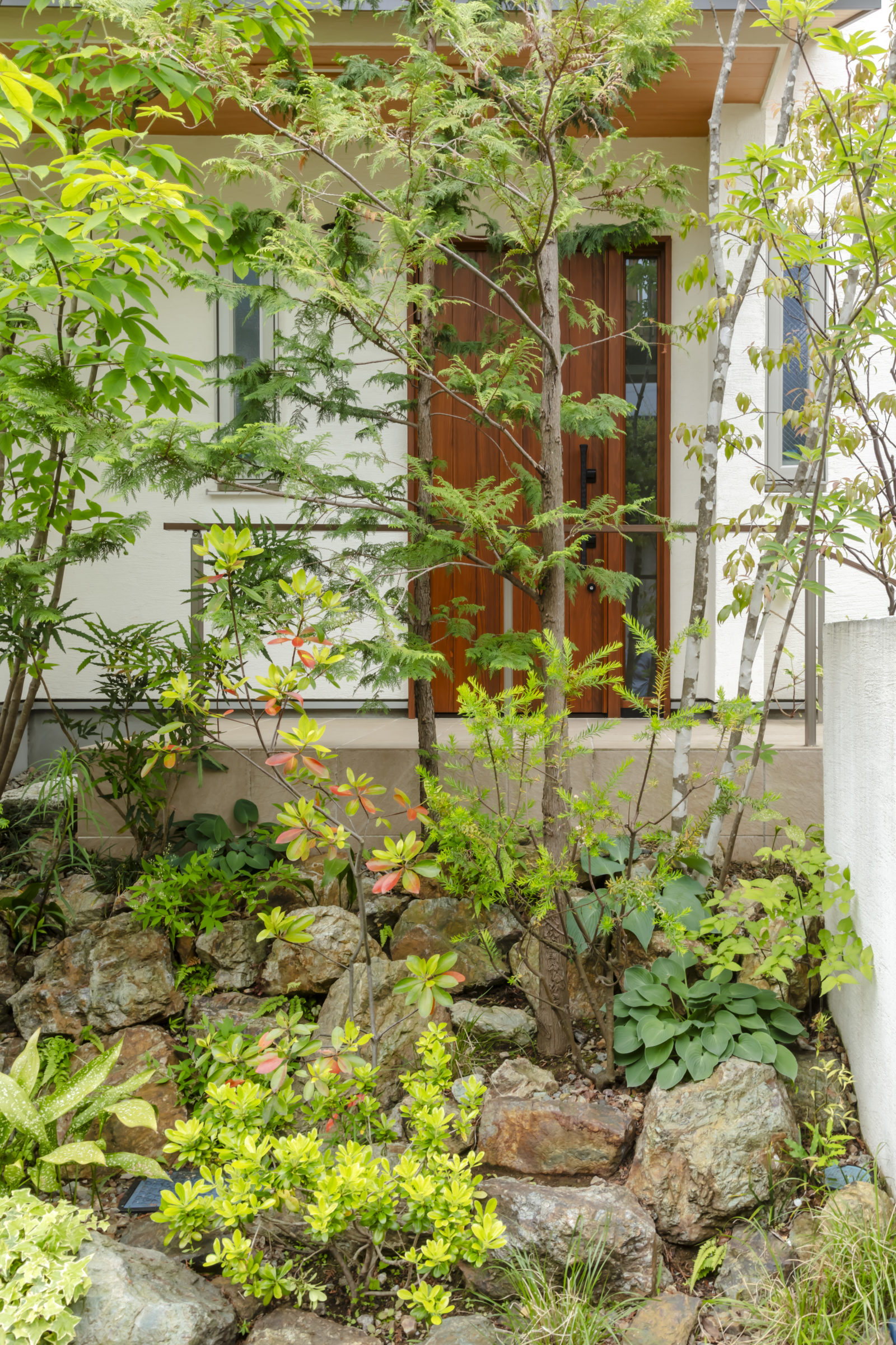 機能的な家庭菜園と、癒しの雑木の庭という要素が共存し、暮らしの中で循環していけるような計画とした。前面道路に面した雑木の空間は、木立の足元に美しい色合いの岐阜チャート石を組み合わせ、アプローチはホワイトセメントの洗い出し仕上げとすることで、明るく華やかなエントランス空間を創出した。