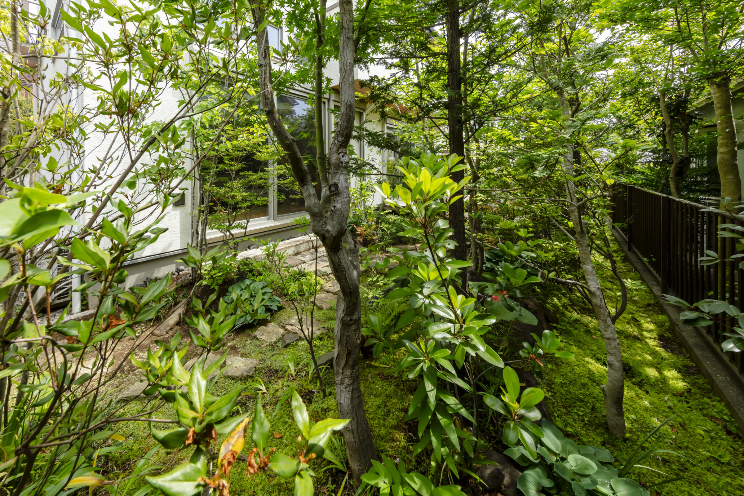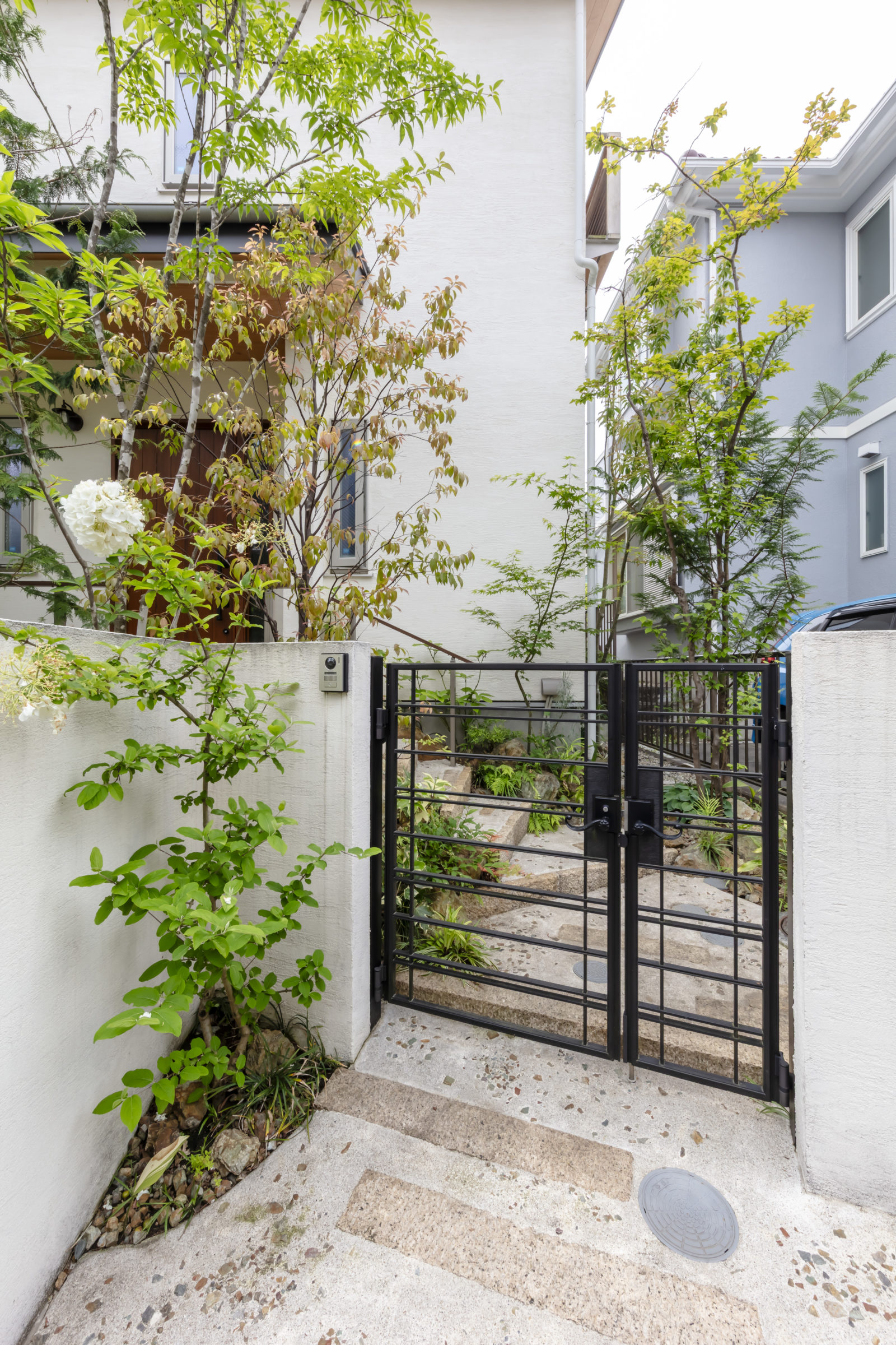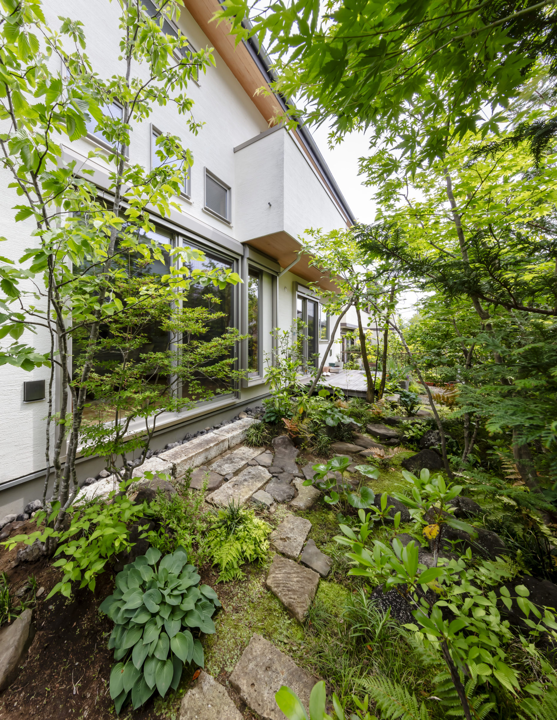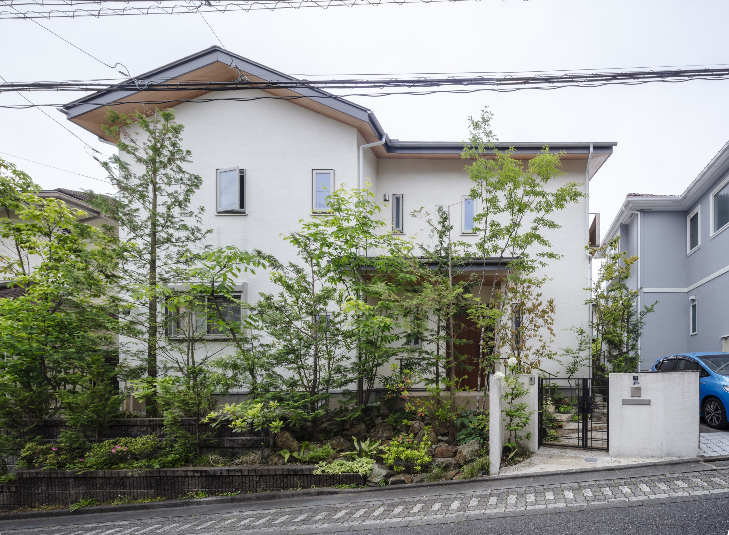 機能的な家庭菜園と、癒しの雑木の庭という要素が共存し、暮らしの中で循環していけるような計画とした。前面道路に面した雑木の空間は、木立の足元に美しい色合いの岐阜チャート石を組み合わせ、アプローチはホワイトセメントの洗い出し仕上げとすることで、明るく華やかなエントランス空間を創出した。