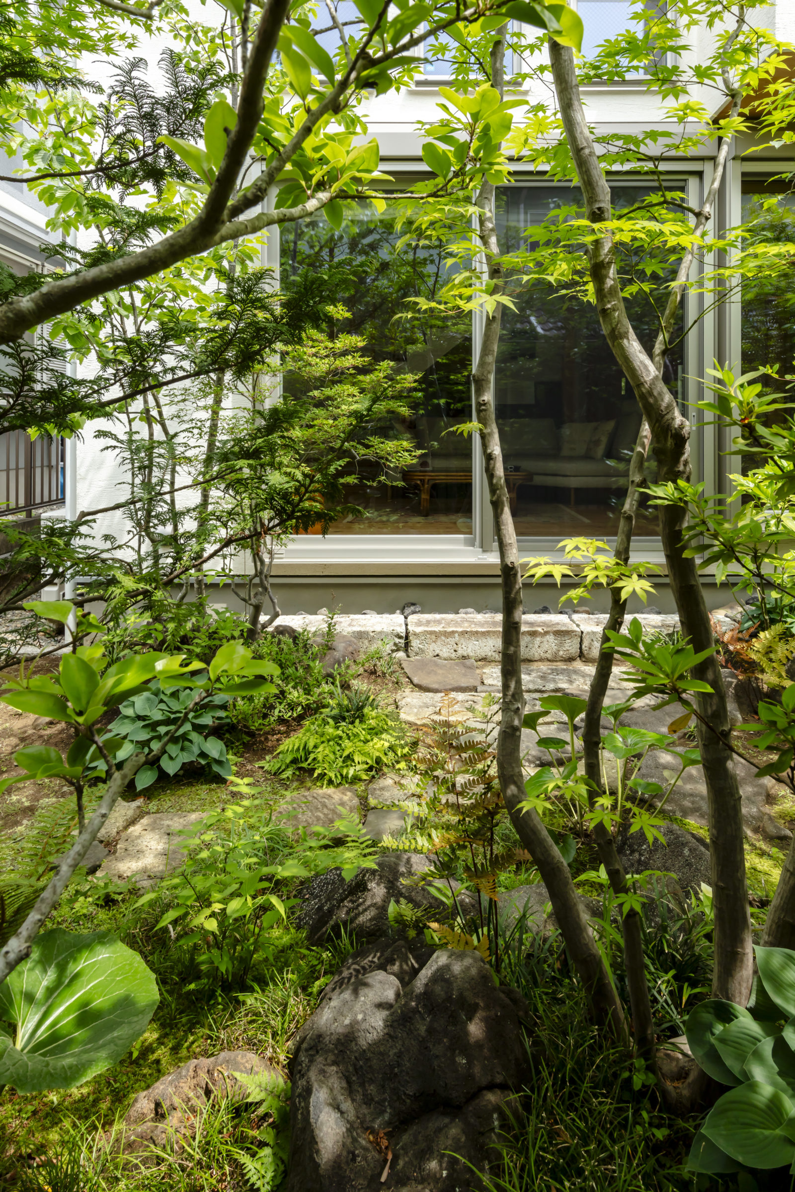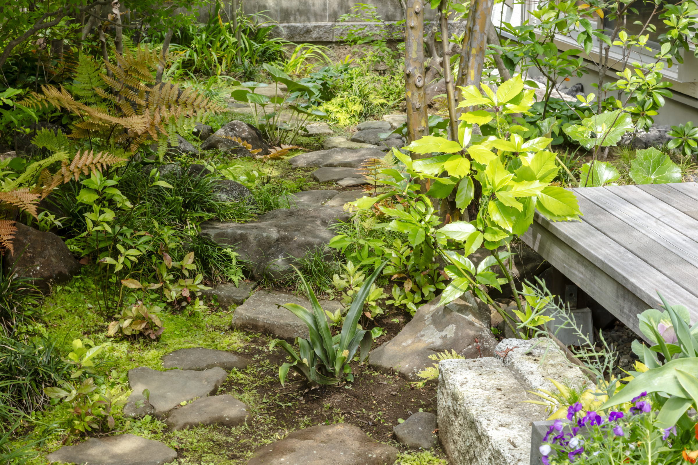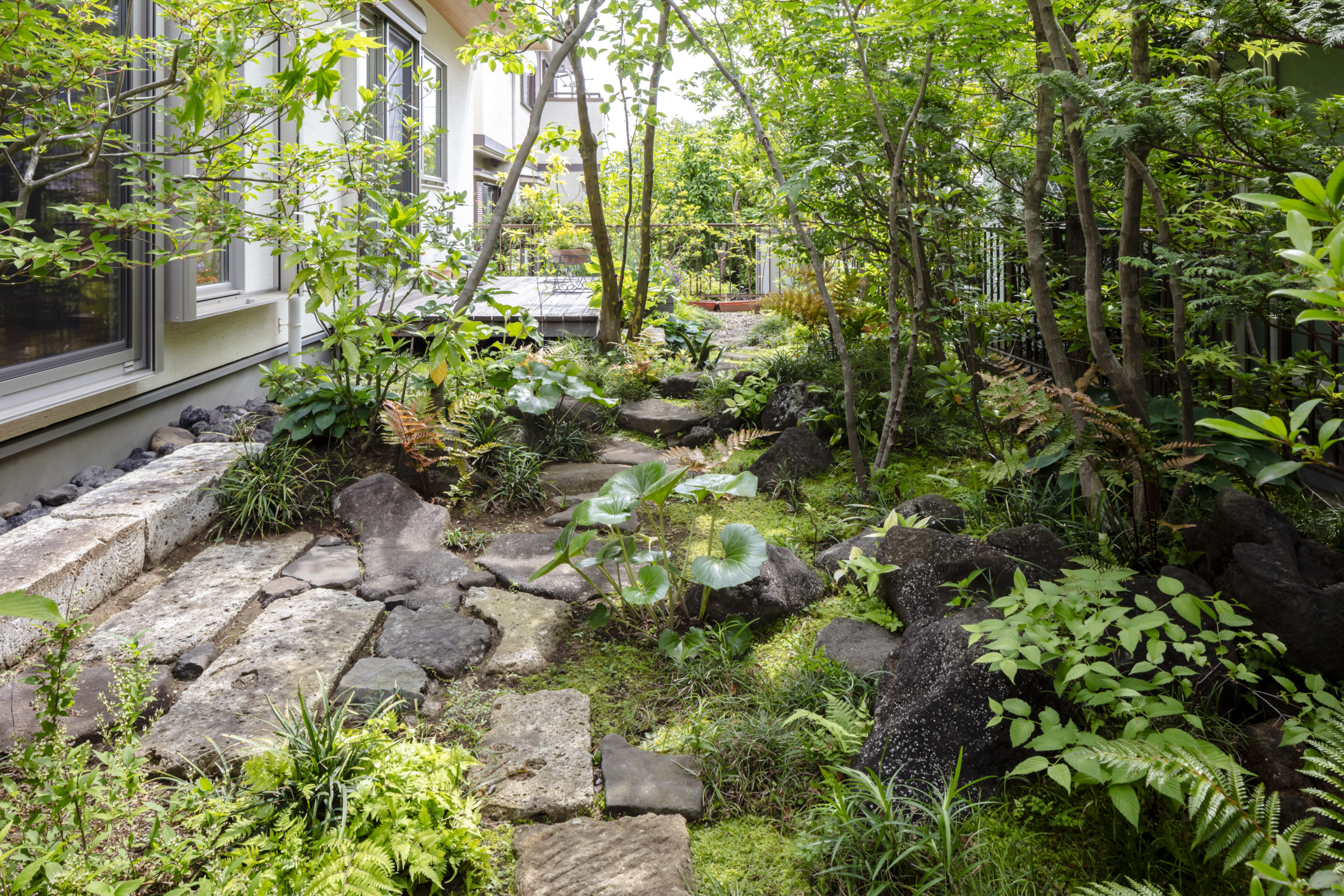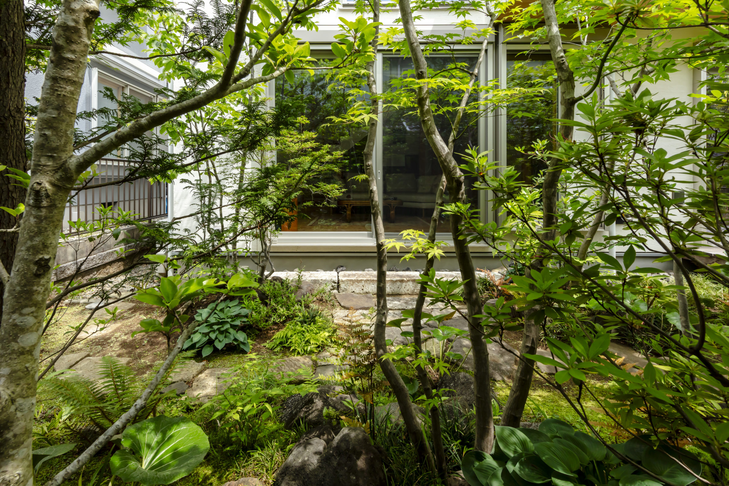 機能的な家庭菜園と、癒しの雑木の庭という要素が共存し、暮らしの中で循環していけるような計画とした。前面道路に面した雑木の空間は、木立の足元に美しい色合いの岐阜チャート石を組み合わせ、アプローチはホワイトセメントの洗い出し仕上げとすることで、明るく華やかなエントランス空間を創出した。