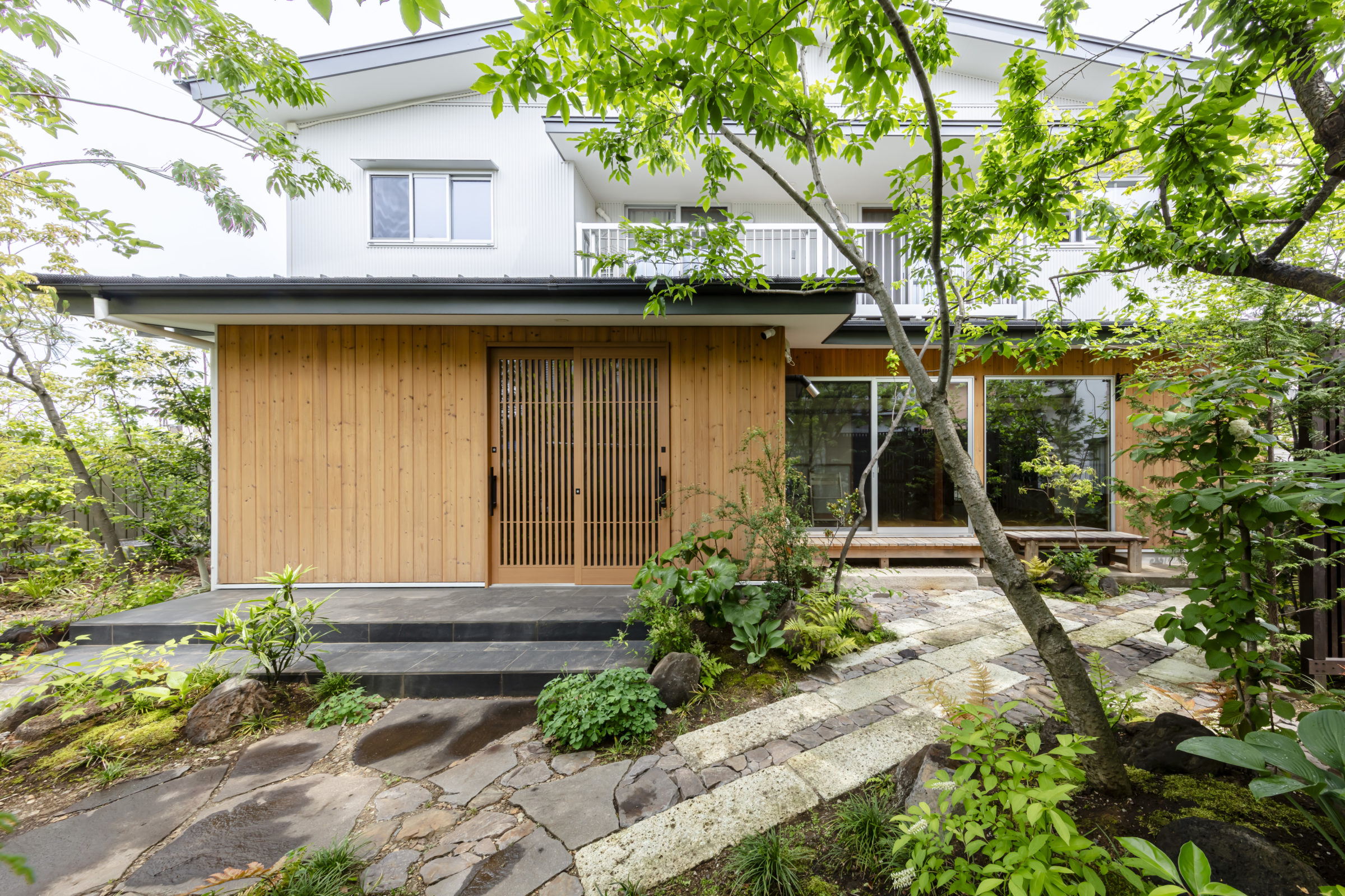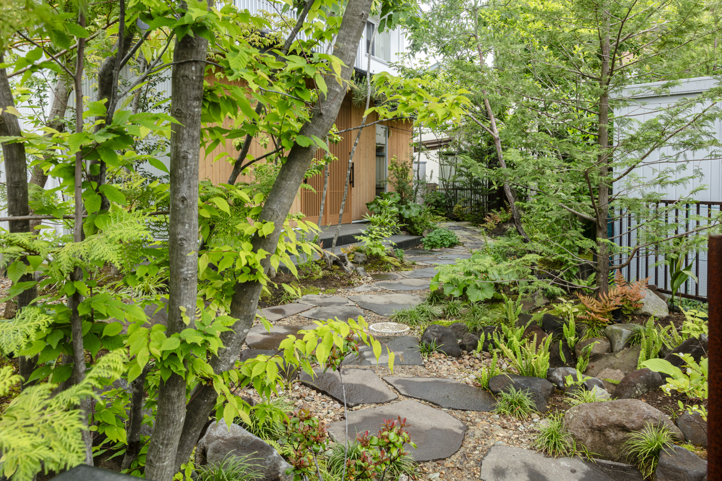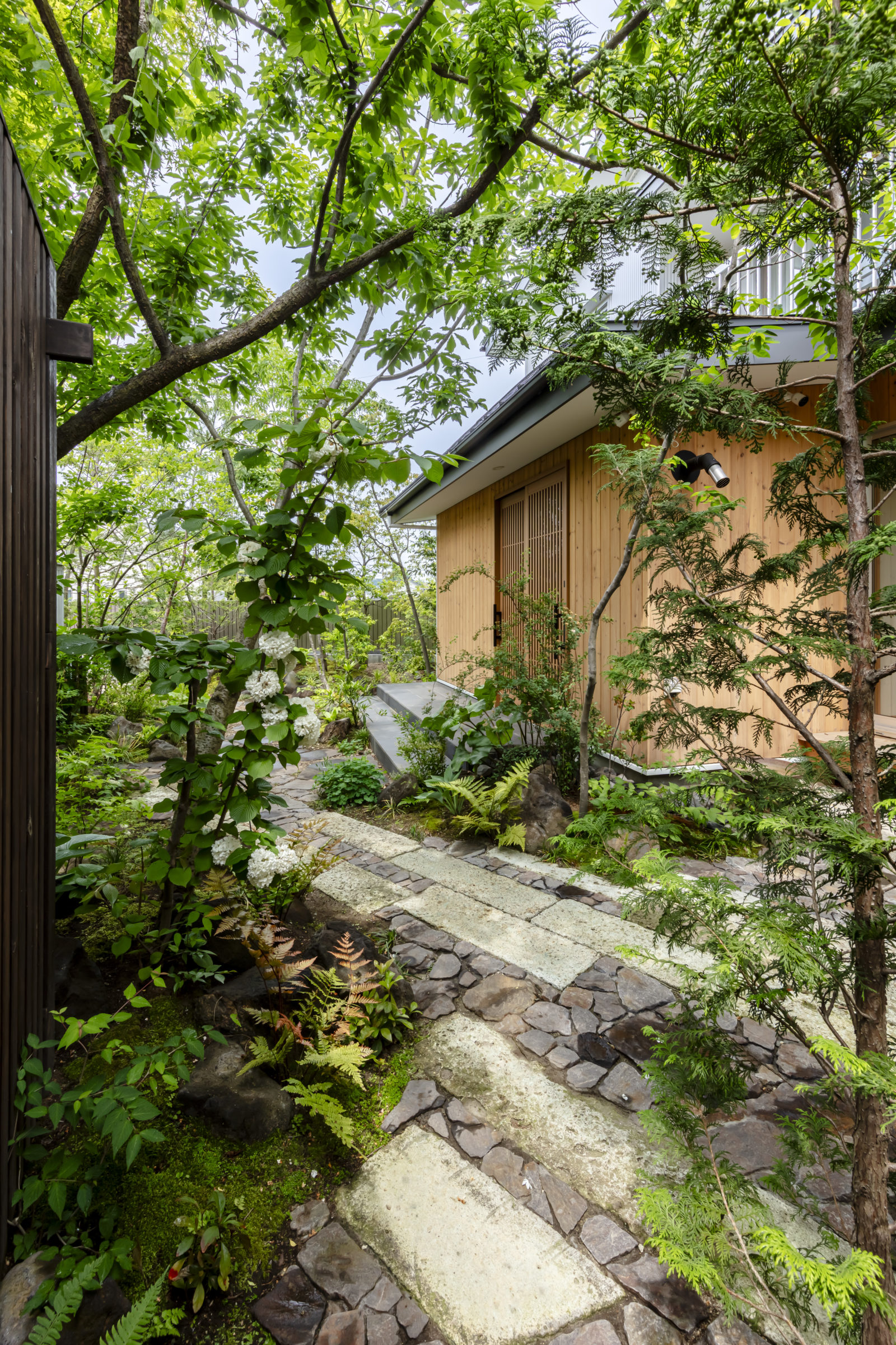 大きな木々に囲まれ、家族でバーベキューや食事会ができる空間を計画。もともとあったかのような、自然な外空間を作ることを意識した。四角形ではない変則的な区画だからこそ出せる奥行感、コナラやヤマモミジ、アカシデなど、雑木林で主木になるような木々を起伏を付けた地形に植栽した。リビングルームに面したメインガーデンでは、古材の大谷石と幡豆石の広い石張りエリアを計画。玄関アプローチは大きなサイズの石板を使用し、エントランス入口から奥へ進むにつれ、山の中に入っていくかのような雰囲気を目指した。既存の梅の木や前宅から移植したサクランボの木など、果実の収穫も楽しめる植栽計画とした。