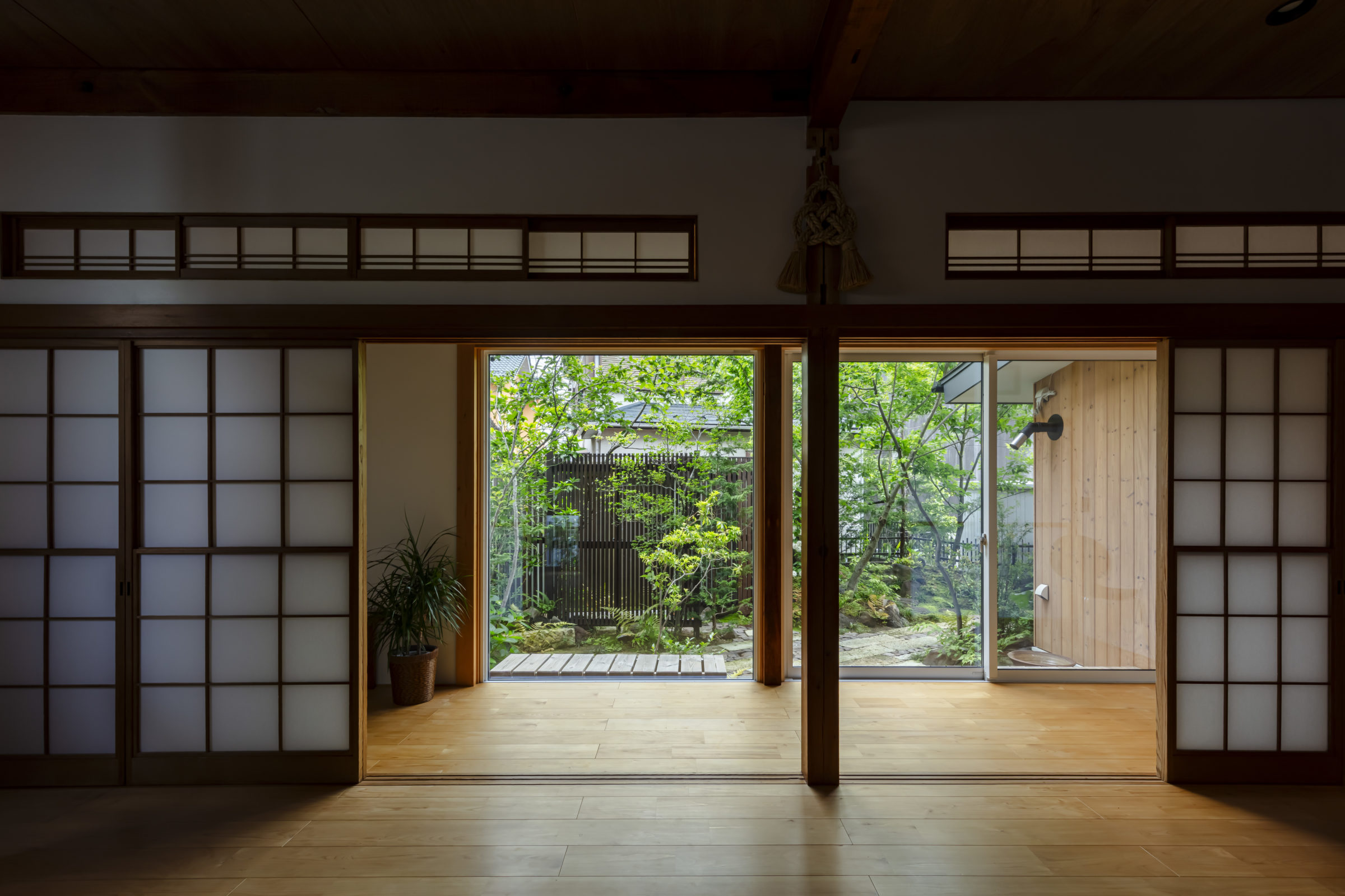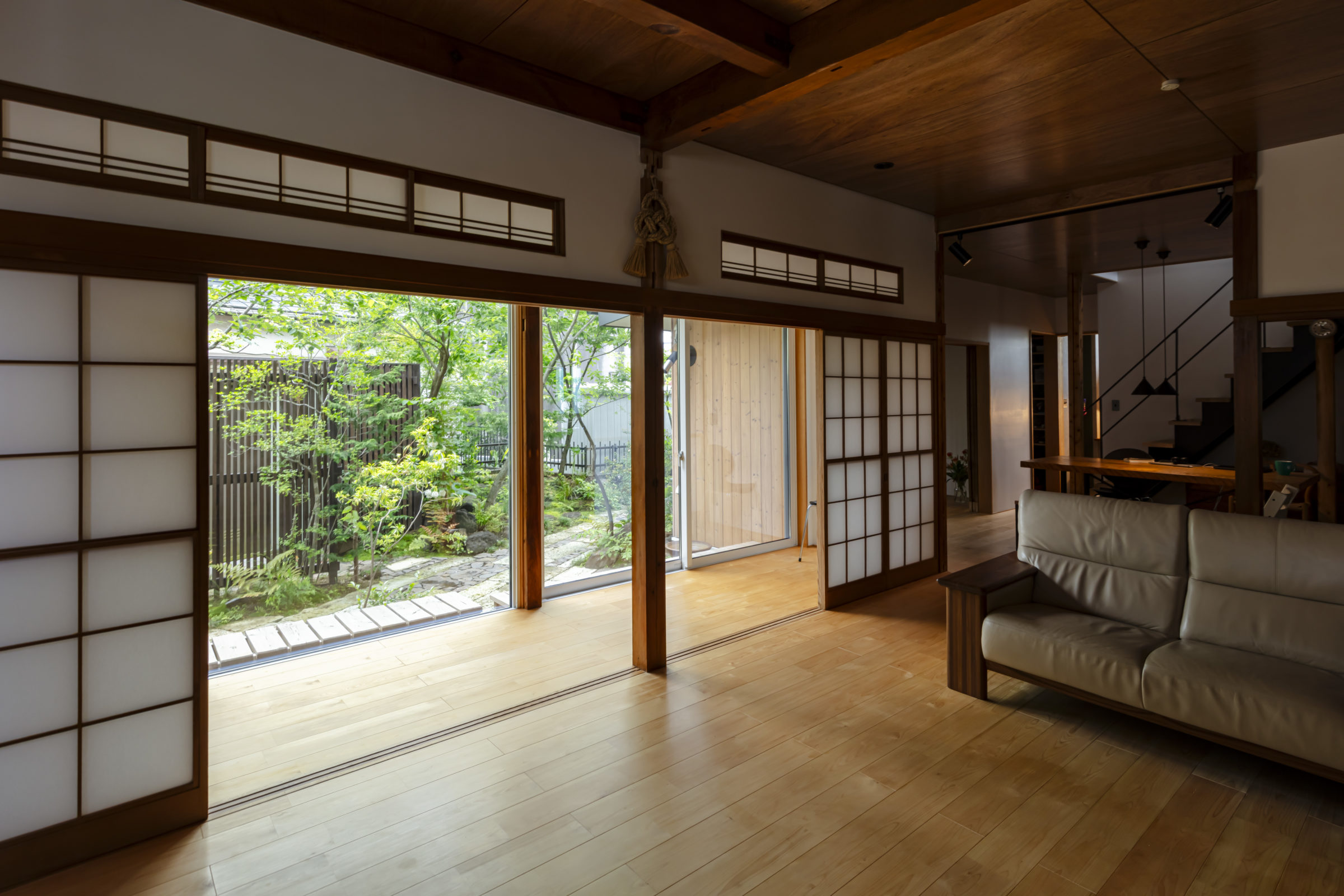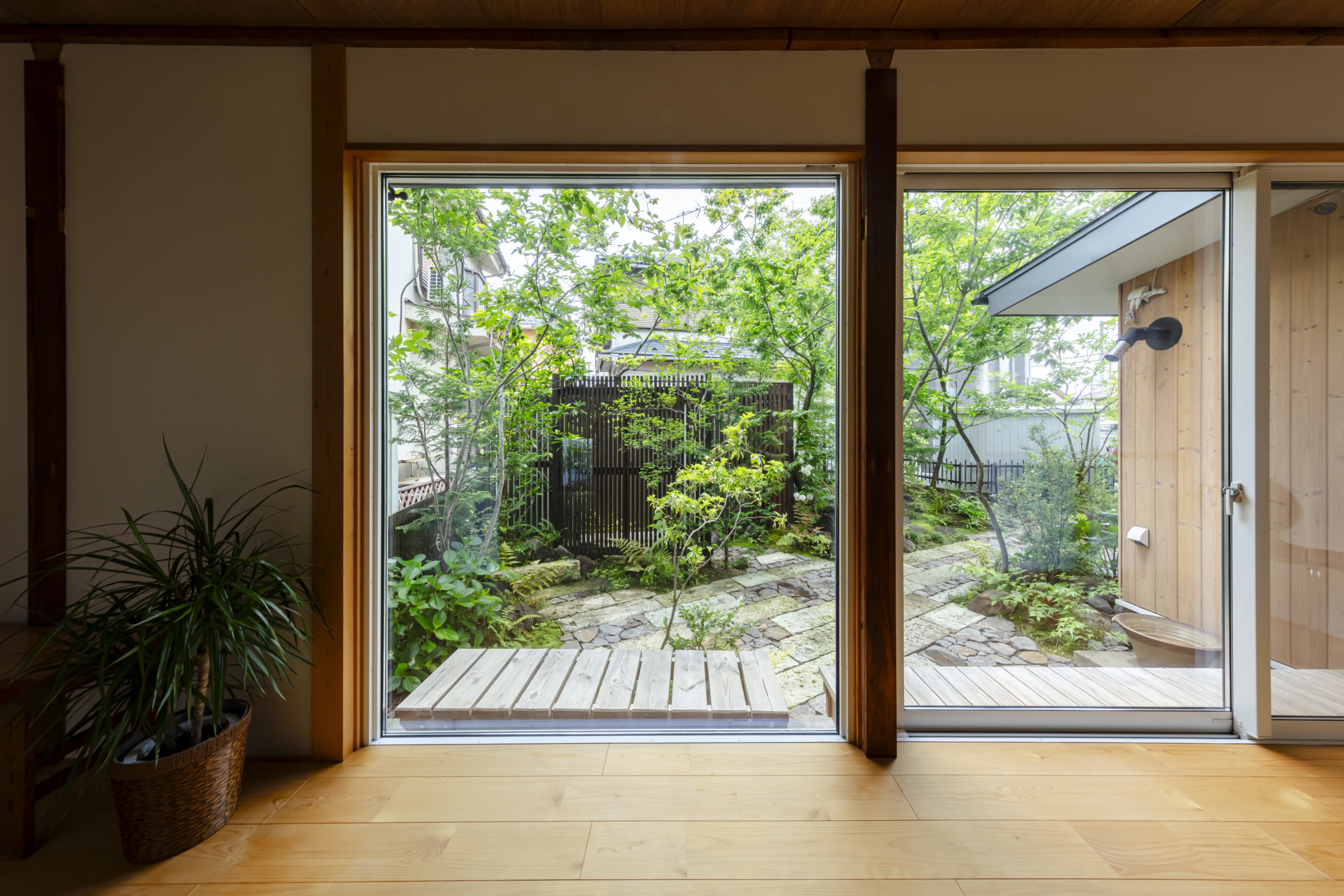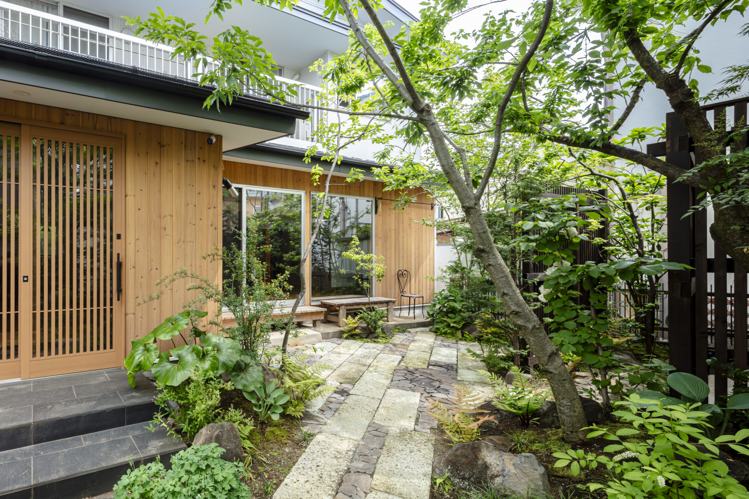 大きな木々に囲まれ、家族でバーベキューや食事会ができる空間を計画。もともとあったかのような、自然な外空間を作ることを意識した。四角形ではない変則的な区画だからこそ出せる奥行感、コナラやヤマモミジ、アカシデなど、雑木林で主木になるような木々を起伏を付けた地形に植栽した。リビングルームに面したメインガーデンでは、古材の大谷石と幡豆石の広い石張りエリアを計画。玄関アプローチは大きなサイズの石板を使用し、エントランス入口から奥へ進むにつれ、山の中に入っていくかのような雰囲気を目指した。既存の梅の木や前宅から移植したサクランボの木など、果実の収穫も楽しめる植栽計画とした。